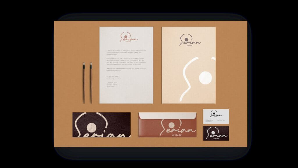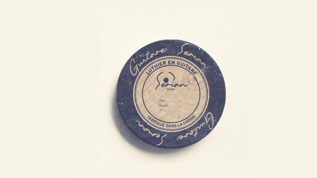 Le “S” de Serian qui dessine le contour d’une guitare acoustique. Le nom écrit à la main inspiré de sa propre écriture. Les tons bois chauds et la touche de vert nacre, comme la marqueterie qu’il pose sur ses instruments.